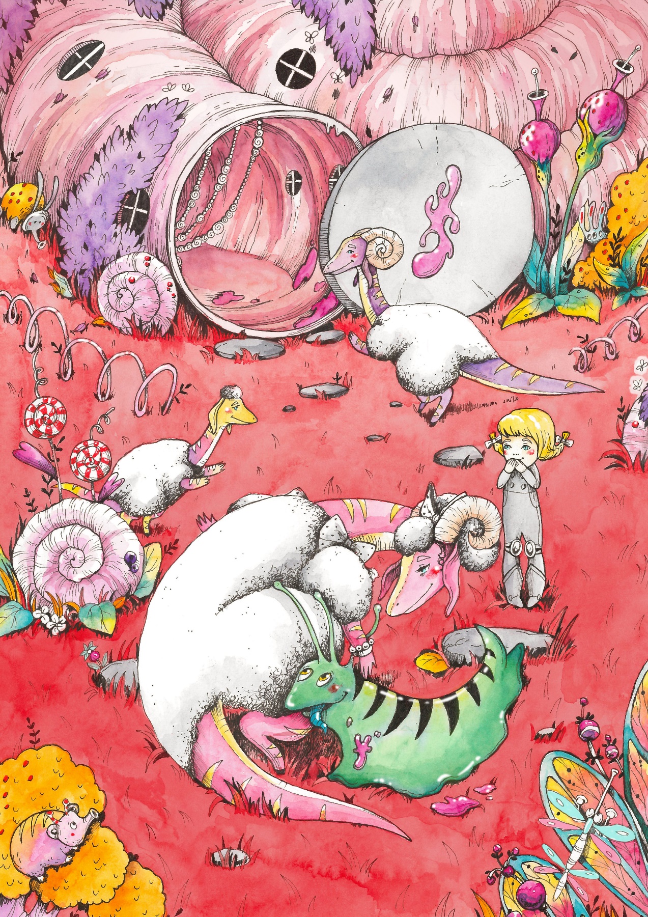 Монстрик прискакал к Бебелле и стал тереться о её лапы. Белая шёрстка Бебеллы тут же покрылась розовой слизью.