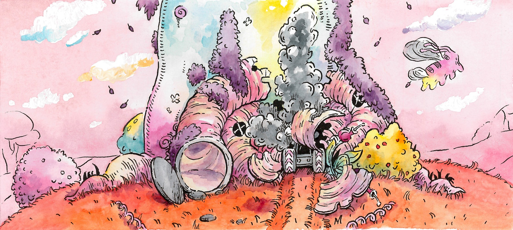 Лисана прижалась всем телом к спине червящера, пальцы побелели от напряжения, глаза слезились от ветра. «Больше не могу» – прошептала она. И тут она увидела Бебеслава и Бебеллу, бегущих навстречу. Они махали лапами и что-то громко блеяли, выпучив от страха глаза. Лисана разобрала только «бегите», «кошмар» и «хрюкомякус». Червящер резко развернулся, сеть выскользнула из пальцев Лисаны, её швырнуло в воздух, и, дрыгая руками и ногами, она шлёпнулась в мягкий лист лопуховника. Лисана соскользнула по гладкому листу и испуганно затаилась под ним.