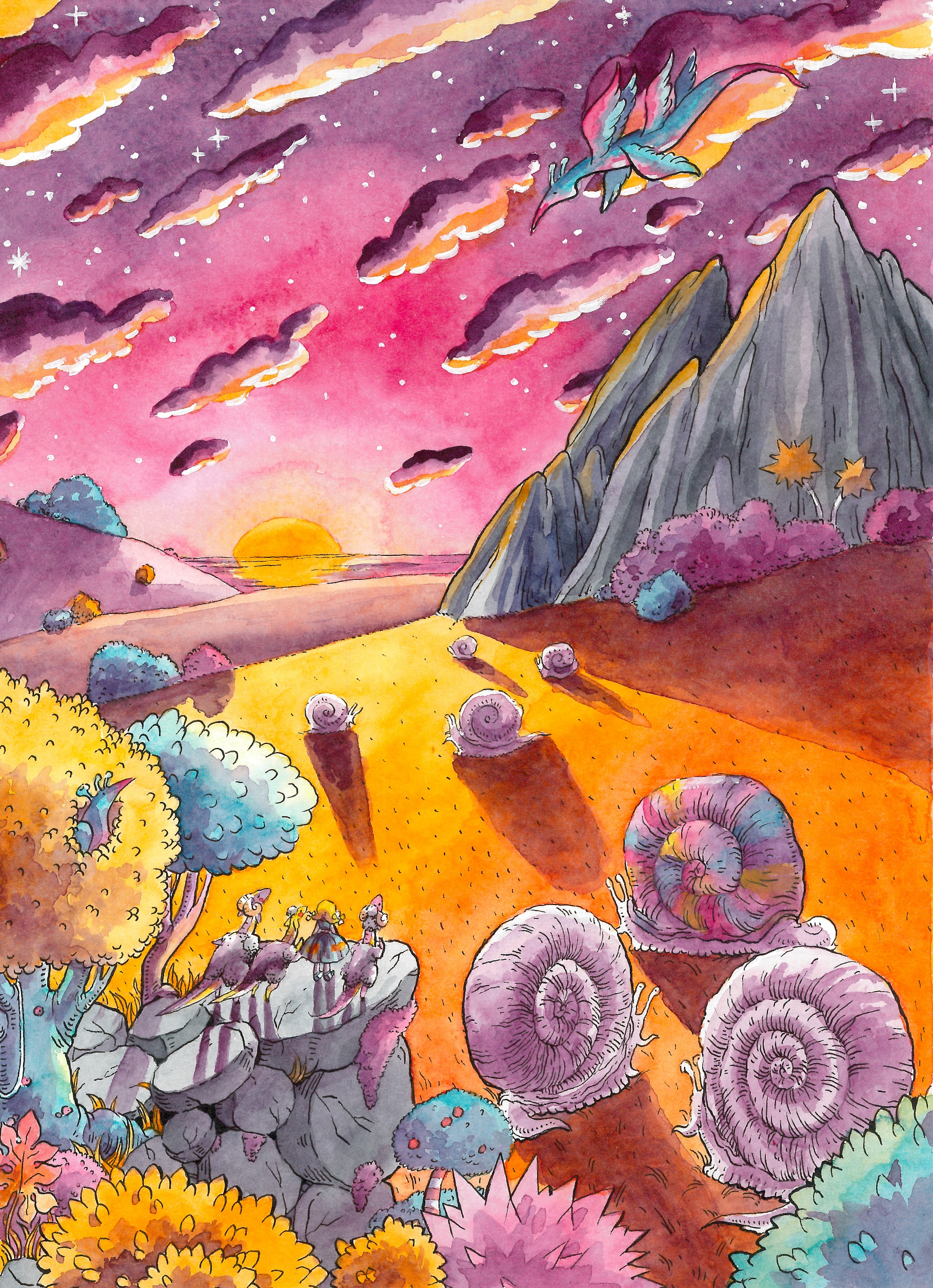 Пришла пора Белорожке расставаться со своей раковиной. Её напоили виногрушевым соком, натёрли бока листьями базилилии. Баранозавры сели вокруг улиткодонтихи и тихо хором заблеяли. Белорожка подняла передние лапы, потянулась вверх, гулко охнула, и раковина отвалилась, скатилась со спины, оперлась о ствол Баодеда. Бебеша первый заскочил в отверстие раковины и скрылся в тени. Бебестрелли подбежал к дому-спирали и принялся чертить на ней овалы будущих окон. Все остальные проследовали за освободившейся Белорожкой в сторону ручья.