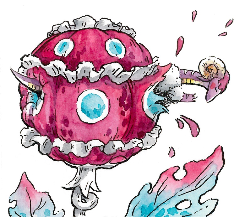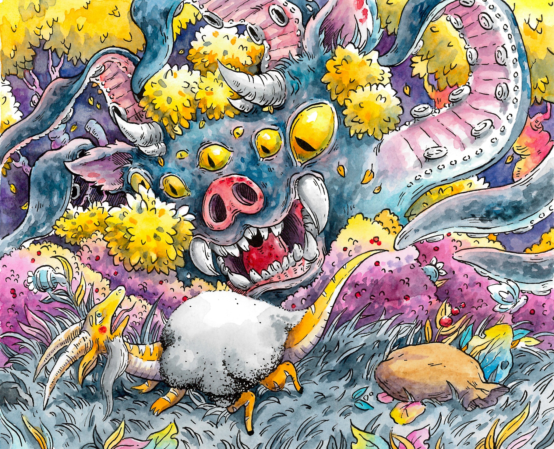 Земля задрожала, небо потемнело, и жуткий, леденящий душу рёв сотряс лес. Притихшие кочегрыжки разлетелись и спрятались среди цветов. Испуганный Берендей задрал голову и увидел, как на него с ветвей спрыгнуло огромное отвратительное кровожадное чудовище. Его глаза горели ненавистью, ядовитые клыки нацелились на горло несчастного кочегрыжника, длинные когти приготовились разорвать свою жертву. Берендей не успел отскочить, беспощадный монстр рухнул на него и придавил к земле. Ужас придал силы бедному Берендею, он извернулся и чудом выскользнул из цепких клешней и липких щупалец, сдавивших его несчастное тело.