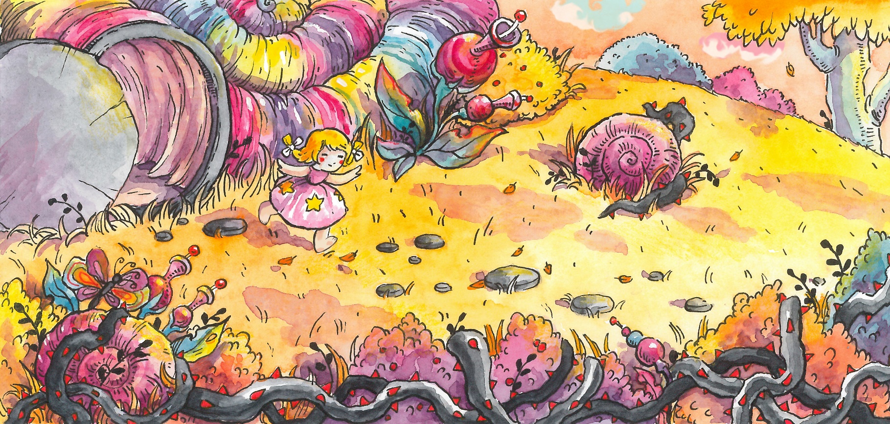 Вдруг, «Ой!!!» – что-то очень больно кольнуло в пятку. Лисана запрыгала на одной ноге, разглядывая, куда это она наступила. По земле, прямо на тропинке, стелилась извивающаяся ветвь диковинного растения. Лисана никогда раньше таких не видала. Искорёженный чёрный стебель и зазубренные пятнистые листья были утыканы тонкими, острыми шипами. Лисана огляделась по сторонам. Зловредные растения оплетали кусты, чернели на полянах, заползали на тропинку. Осторожно переступая через колючки, Лисана добралась до ручья. Там она умылась, сполоснула ранку на ноге, обвязала ступню длинным листом потропинника и также аккуратно вернулась домой.