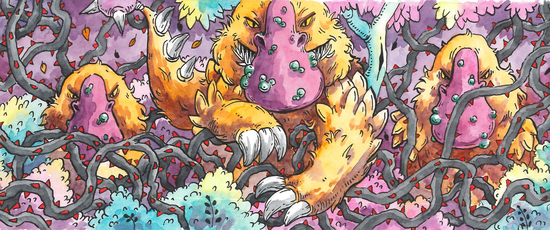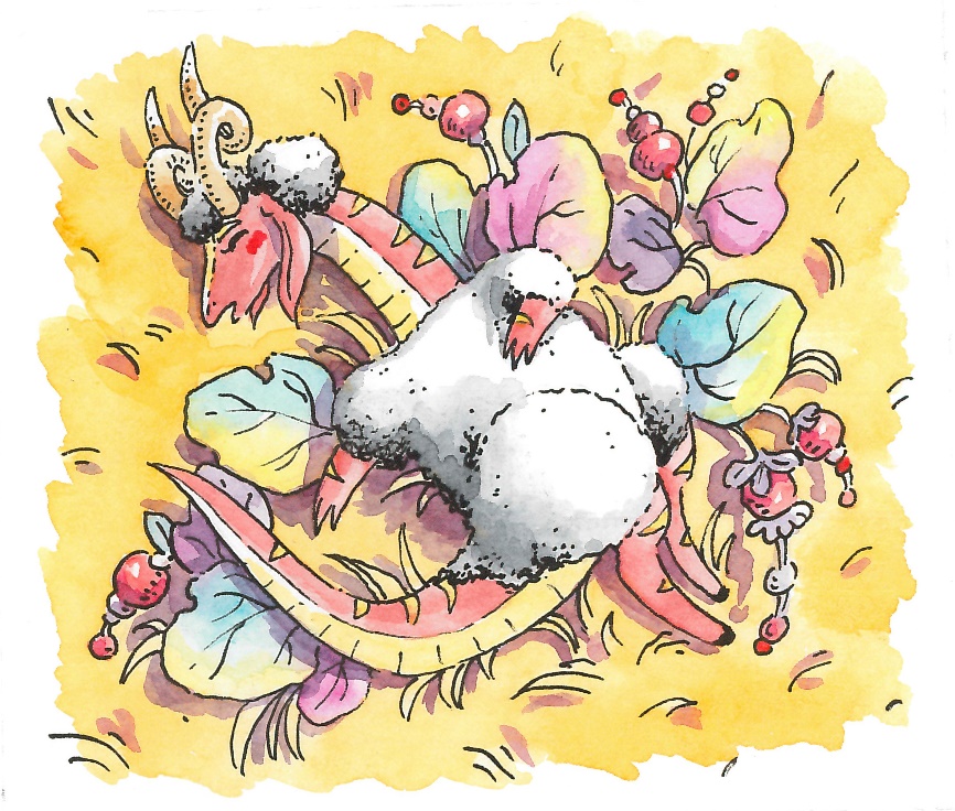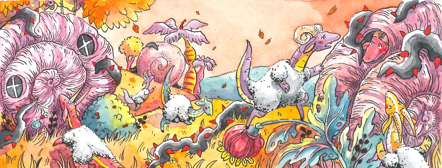 – «Бггхрааа!», «бггхрааа!» – противные крики прямо над головами баранозавров заставили их пригнуться к земле. В колючках, опутавших ветви тянувшихся к небу баодедов, свили уродливые гнёзда летающие твари. Они были похожи на ярких птиц с синими спинами и красными брюшками, только вместо клювов у них над широкими пастями торчали хоботы, вместо ног – три пары коротких тараканьих лап. Твари летали над баранозаврами, пытаясь ухватиться хоботами за рога.