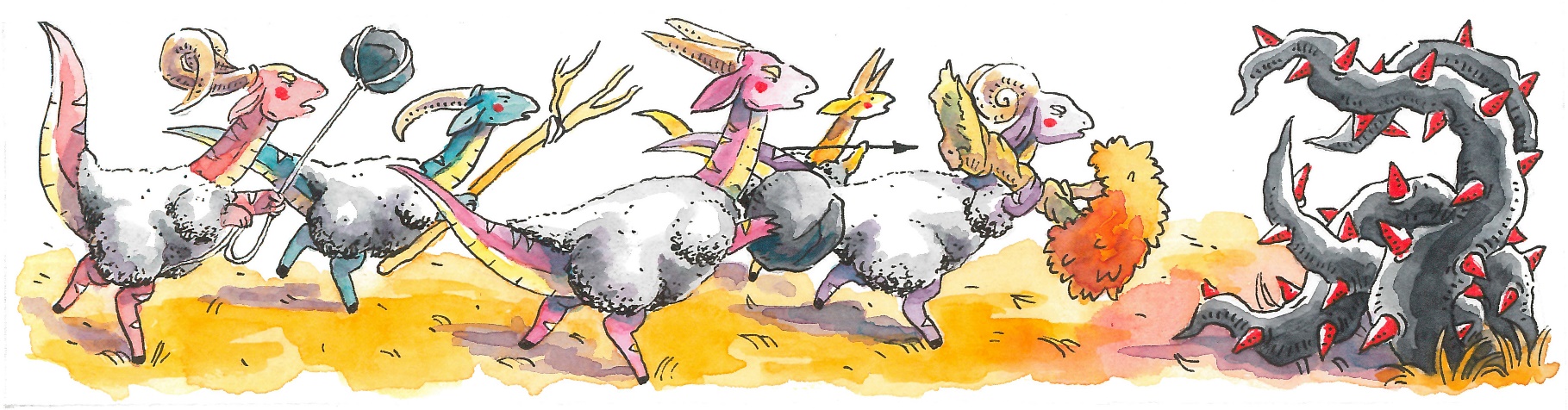 Пока одни баранозавры что-то ломали, выдалбливали, связывали, скручивали, чистили и смазывали, остальные, под предводительством вожака Бенокентия бросились на бой с сорняками. Они рвали их зубами, выдирали рогами, кромсали когтями и топтали копытами. Колючки не сдавались – путались в шерсти, прыскали липким едким соком, больно впивались в лапы. Баранозаврам удалось прорубить себе дорогу на несколько метров вглубь чёрных зарослей, но дальше пробиваться было уже некому. Борцы с сорняками залечивали саднящие раны, вынимали занозы и жалобно блеяли.