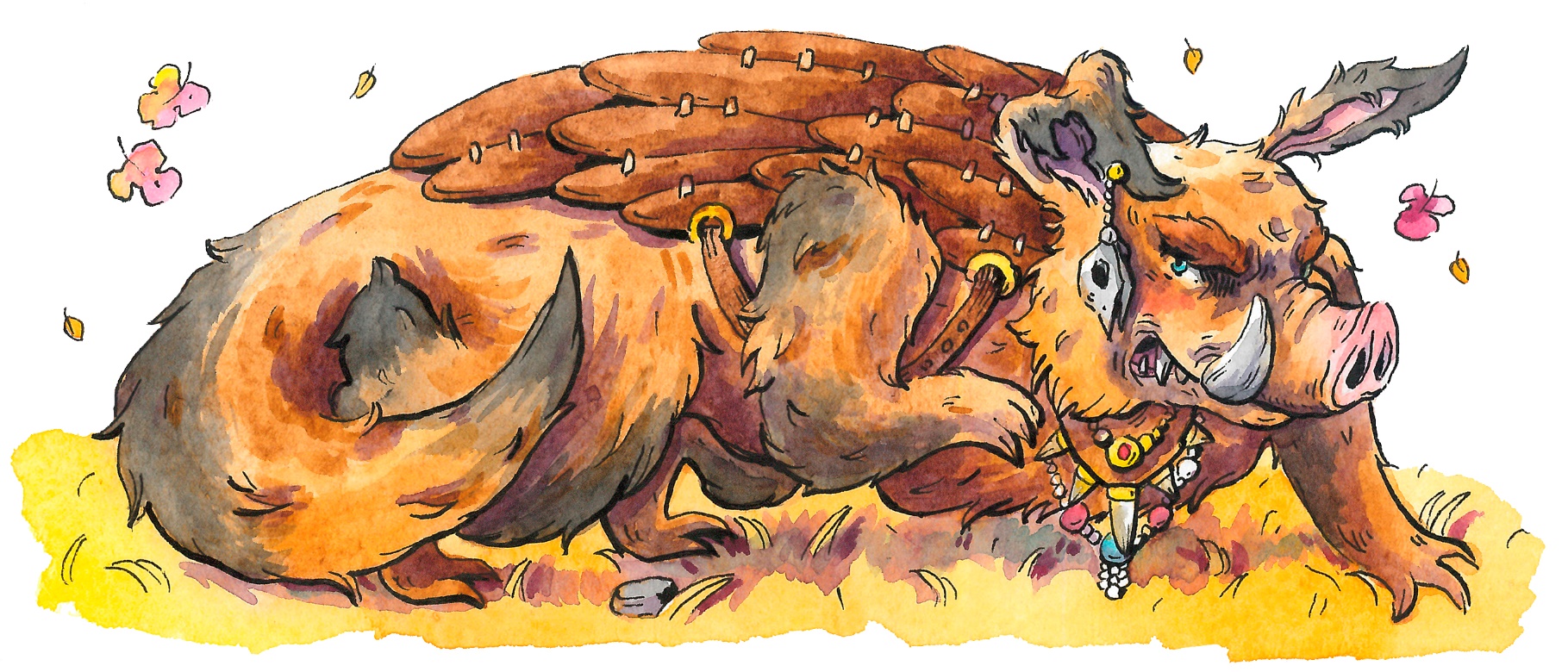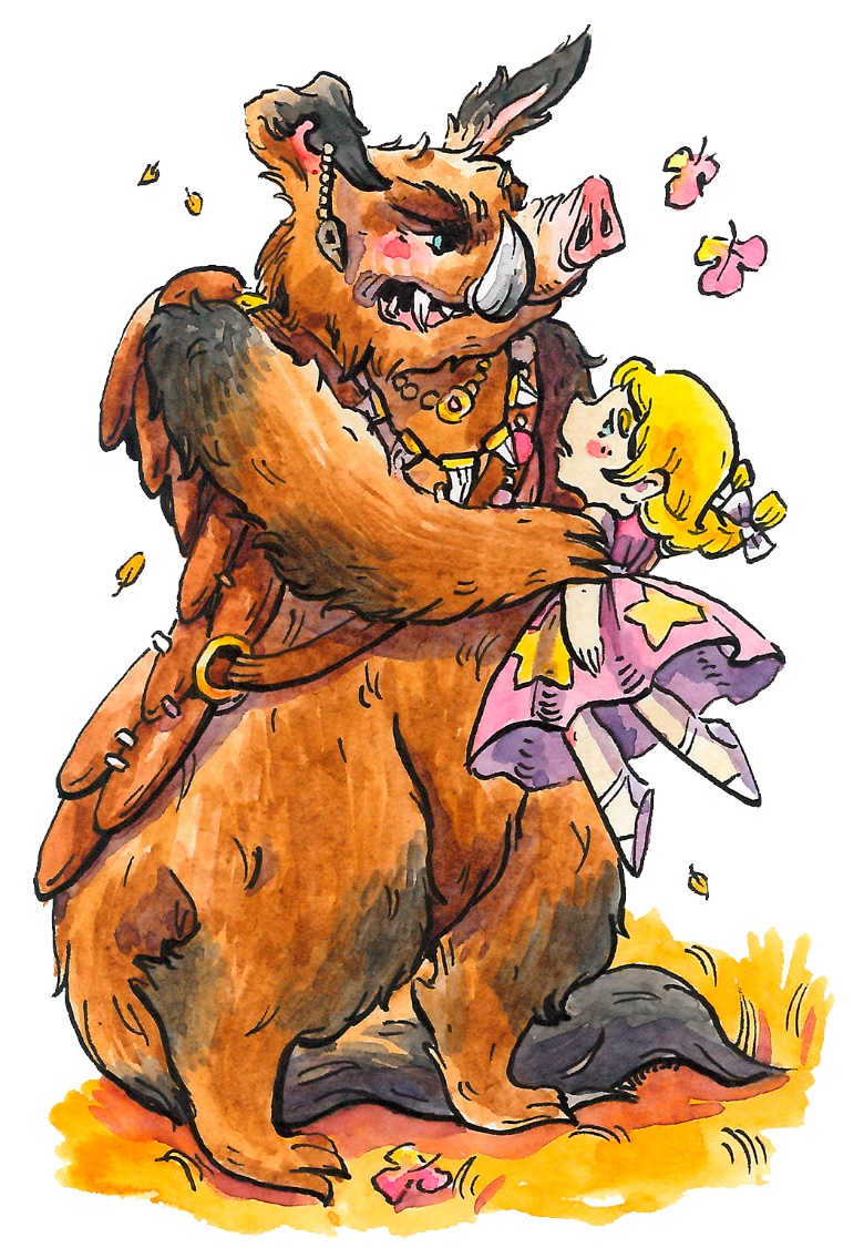 Кабанозавры столпились вокруг корабля, хором выхрюкивали незатейливую мелодию и раскачивались. Самый старый, заросший седой щетиной и очень толстый кабанозавр в длинной цветастой попоне дирижировал толпой поющих, размахивая длинным деревянным посохом. Бесчисленные браслеты на его лапах раскачивались в такт, а длинная шерсть, убранная в тяжёлые косы, подметала землю. Мощные молодые кабанозавры в полном боевом облачении выстроились вдоль вытоптанной тропы, ведущей к кораблю.