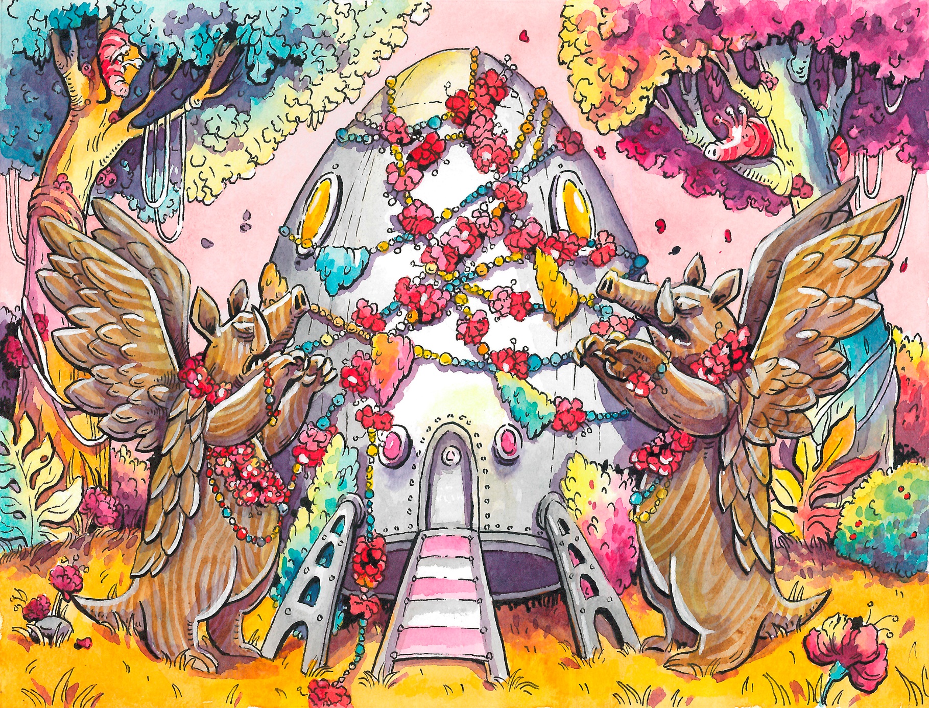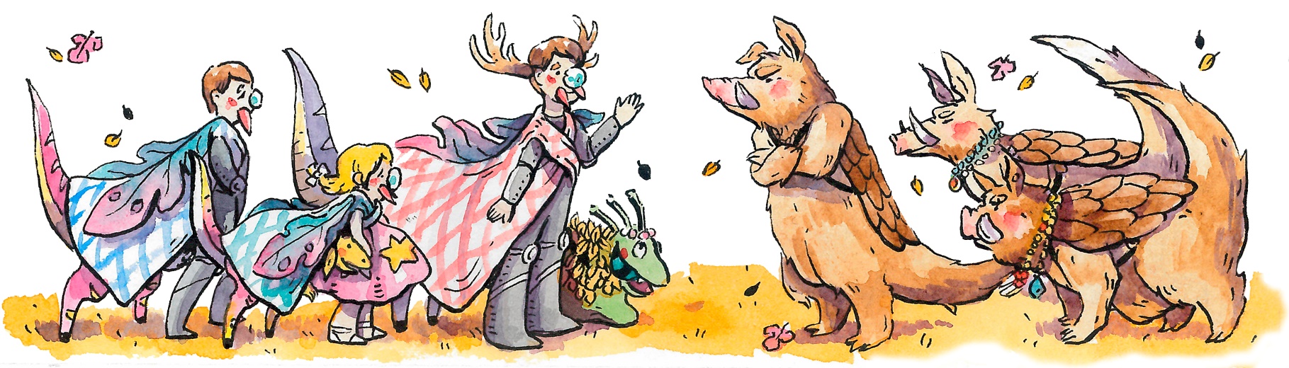 Лисана разглядывала деревянные фигурки, стоящие по обе стороны тропинки, ведущей к кораблю, заботливо украшенные цветными бусами и яркими лепестками. Скульптуры крылатых кабанозавров у входа в корабль упирались головами в кроны деревьев. Раздалось тихое хрюканье – кабанозавры встречали гостей песнями.