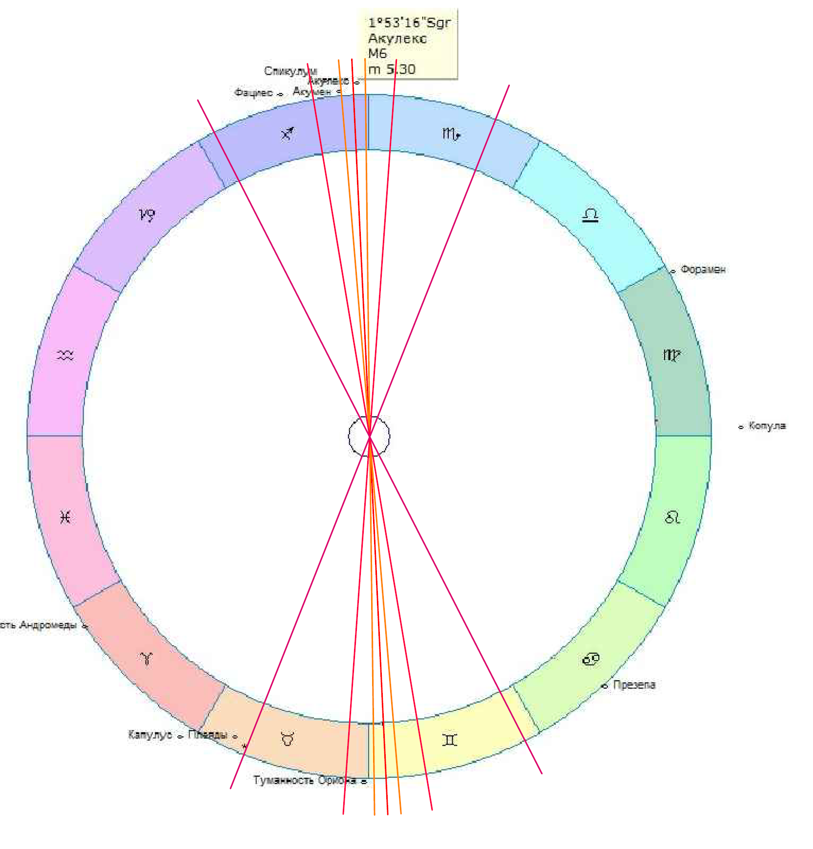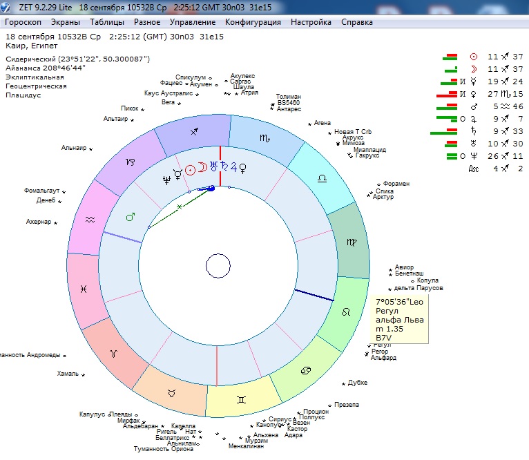 При рассмотрении следующих вопросов автор рекомендует установить программу Zet версии 9.2.29, она имеется в свободном доступе и достаточна для нашего обзора. Необходимо скачать дополнительные эфемериды, так как в базовой версии программы, можно проводить анализ только до 27.02.3002 г до нэ. В установках программы, в разделе зодиак, звезды выбираем просмотр до 2,0 величины с отражением туманностей. В установках зодиак выставляем сидерический. Здесь же в разделе Айанамса выставляем произвольный, позиция Айанамса на 2000 год – 23051/22// . Скорость прецессии по последним научным исследованиям составляет 25765 лет или 50,// 300784 в год.