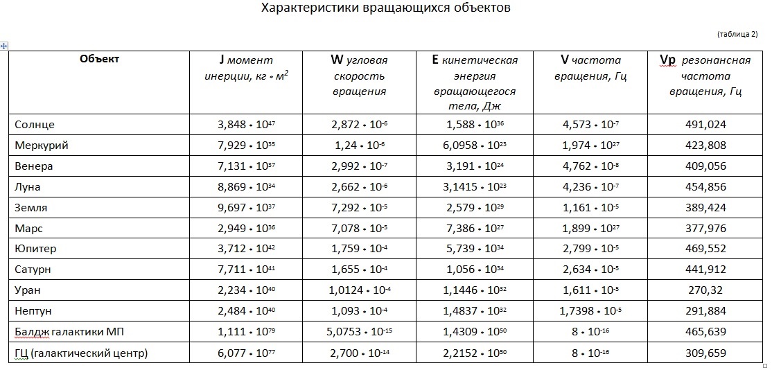 Для расчетов в таблице 1 собраны физические данные объектов вращения. Далее по вышеприведенным формулам получаем сравнительные характеристики объектов вращения и сводим их в таблицу 2. Прошу обратить внимание, автор вводит новый объект в Астрологию – Галактический Центр, но обо всем по порядку.