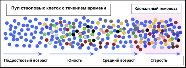 накапливаются со скоростью примерно 10 в год, так что все ГСК немного отличаются у юношества (ранних взрослых). Эти различия проявляются в недостатках и преимуществах для выживания и участия в производстве периферической крови, в результате чего некоторые ГСК «побеждают» с возрастом (эритроциты справа). В то время как расширенные клоны