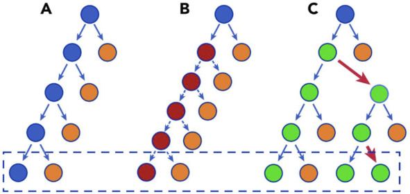 не увеличивает пул стволовых клеток и не превосходит нормальные ГСК. (С) ГСК имеет небольшой уклон в сторону самообновления. Каждые несколько делений (красные стрелки) он создает дисбаланс, так что