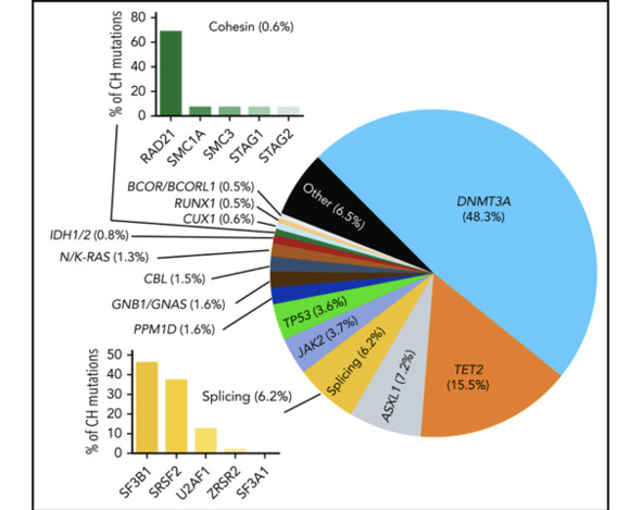 Типы генов, которые рекуррентно мутируют при КГ, в целом делятся на три основных класса: эпигенетические регуляторы, факторы сплайсинга и гены ответа на повреждение ДНК (DDR), с более редким вкладом членов cohesin, сигнальных молекул и гемопоэтических факторов транскрипции.