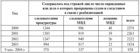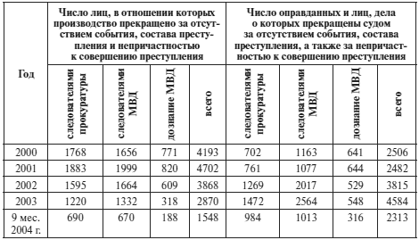 Данные Следственного комитета МВД России за 2000—2003 гг. и девять месяцев 2004 г. по количеству лиц, реабилитированных органами следствия и дознания, а также оправданных и лиц, в отношении которых уголовные дела прекращены судами Российской Федерации, приведены в табл. 1.3 и 1.4.[86]
