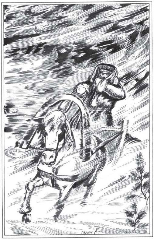 В день отъе́зда Ма́рья Гаври́ловна о́чень волнова́лась. Она́ не ста́ла у́жинать и ушла́ в свою́ ко́мнату. Через полчаса́ Ма́ша[8] должна́ была́ навсегда́ оста́вить роди́тельский дом, свою́ ко́мнату, ти́хую деви́ческую жизнь… На дворе́ была́ мете́ль; ве́тер выл; всё каза́лось ей печа́льным предзнаменова́нием[9]. Ско́ро в до́ме ста́ло ти́хо, все легли́ спать. Ма́ша тепло́ оде́лась и вы́шла в сад. Го́рничная несла́ её ве́щи. Мете́ль не утиха́ла, ве́тер дул навстре́чу, как бу́дто хоте́л останови́ть молоду́ю престу́пницу. За са́дом их жда́ли са́ни. Ма́рья Гаври́ловна и её го́рничная се́ли в са́ни, и ло́шади полете́ли.