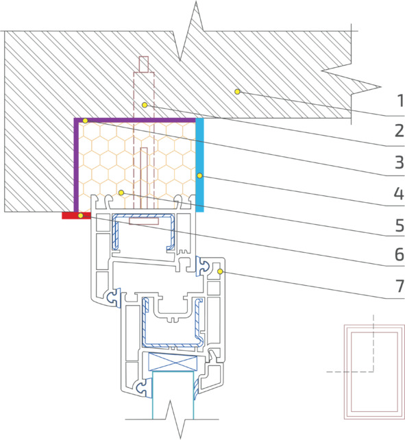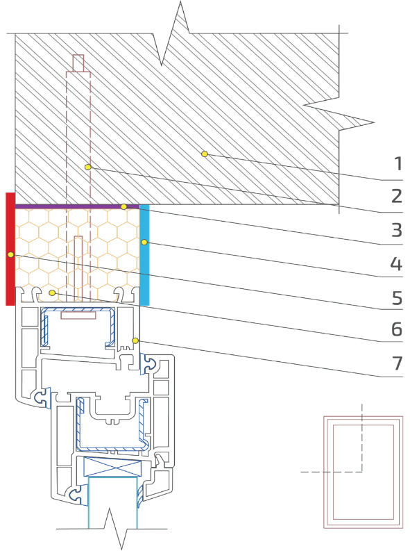 Рисунок 11. Схема монтажного шва узла примыкания оконного блока к стеновому проему без четверти (1 – кирпичная стена; 2 – анкерный дюбель; 3 – дополнительный слой монтажного шва; 4 – пароизоляция монтажного шва; 5 – гидроизоляция монтажного шва; 6 – пена монтажная; 7 – оконный блок)