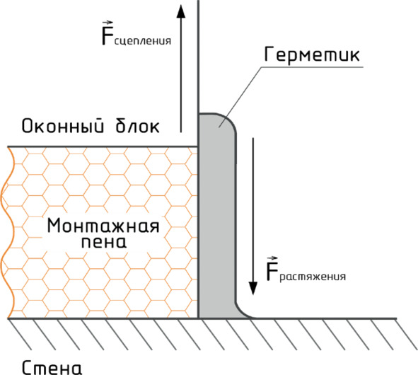 Рисунок 15. Направление действия сил сцепления и растяжения на слой герметика