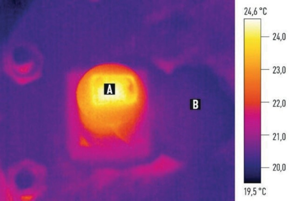 В результате испытаний мы увидели, что в воздух проходит сквозь ленточные материалы без сопротивления, которое могли бы уловить приборы лаборатории нашего исследовательского центра, в то время как Стиз А держит заданное давление в течение не менее 3 ч. Картина распределения температур при подаче теплого воздуха в камеру представлена на рис. 7, 8 (буквой A обозначена лента ПСУЛ, буквой B – герметик Стиз А).