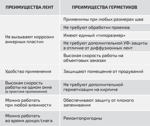 Поэтому далее сосредоточимся только на сравнении лент и герметиков. Вкратце недостатки и преимущества ленточных и, как их порой неправильно называют, мастичных3 систем монтажа сведены в табл. 1.