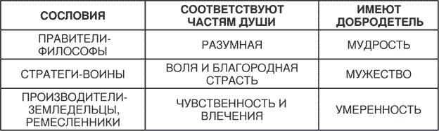 В диалогах «Законы» Платон излагает свое представление об идеальном государстве, которое возникает как единство трех сословий (см. табл. 1):