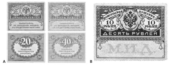 Рис. 12. A – «керенки»; B – марка консульской почты