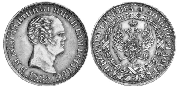 КОНСТАНТИНОВСКИЙ РУБЛЬ – особый тип сер. руб. 1825 г., на котором изображён портрет Константина Павловича Рис. 13 – наследника престола, официально считавшегося императором, но на престол не вступившего и не царствовавшего (отказался от правления в пользу своего брата Николая). Одна из редчайших росс. монет. Известно 5 экз. с надписью на гурте и 3 с гладким гуртом.