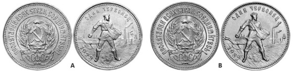 Рис. 15 – Золотой червонец «Сеятель». A – ориг. монета (1923); B – «новодел» (1982)