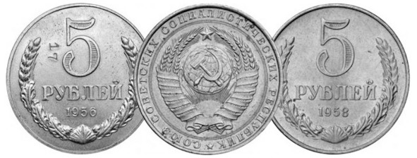 Рис. 16 – Пробная монета 5 руб. 1956 г. (слева) и экземпляр 5 руб. 1958 г. (справа)