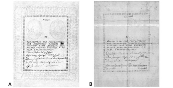 Рис. 8 – Первые ассигнации в России. A – 25 руб. 1769 г.; B – 50 руб. 1769 г.