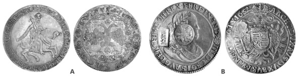 Рис. 9. А – «Первый» руб. Алексея Михайловича (1654); B – «Ефимок с признаком» (1655)