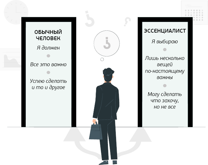 Определить главные 20 % в любой сфере своей жизни, будь то бизнес или увлечения, принципиально важно. Поэтому эссенциалист тратит гораздо больше времени на обдумывание альтернатив, чем обычный человек, а уже потом выбирает максимально выгодную. Эссенциалист не из тех, кто гонится за первым подвернувшимся шансом;