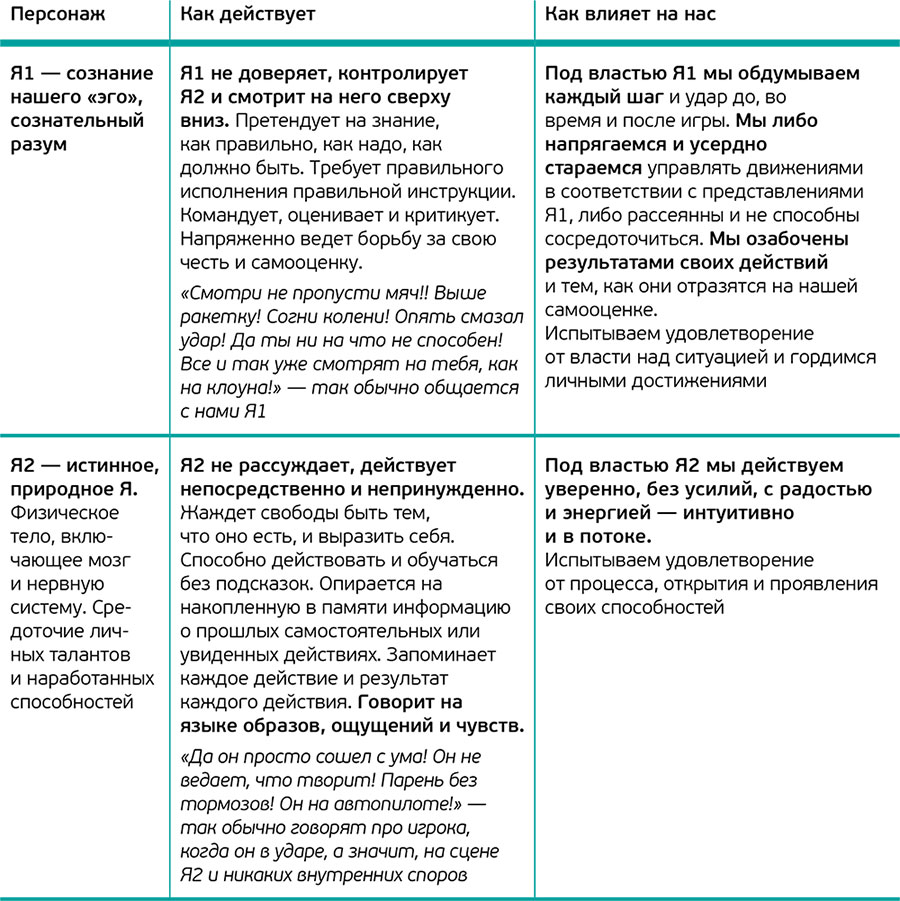 От отношений этих внутренних персонажей и зависит то, как складывается ваша игра или тренировка. Именно в их гармонизации Тимоти Голви видит путь к раскованному высококлассному теннису и рассказывает, какие внутренние навыки этому способствуют.