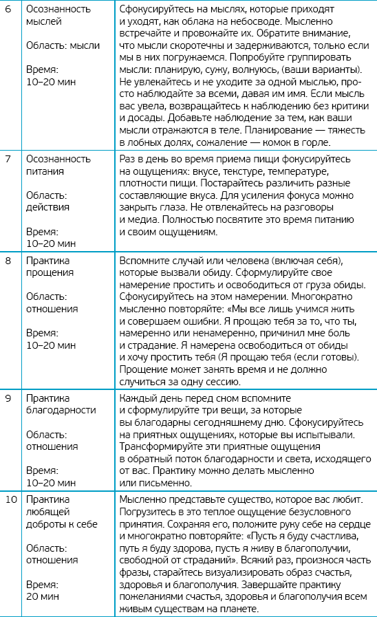 Безусловно, практик осознанности намного больше, чем уместилось в эту статью. Цель осознанности не в их коллекционировании, а в развитии способности быть в контакте с реальностью, в мире с собой и окружающими. Пробуйте эти, ищите новые, используйте наиболее подходящие для вас. Главное, не останавливайтесь после пары попыток со словами: «У меня не получается, это не для меня». Осознанность – навык, требующий времени, постоянного использования и внимания. Все получится.