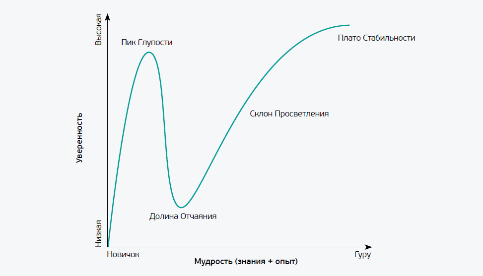 По оси x вы видите реальный потенциал человека: его условные знания и опыт. По оси Y – уверенность. Пока человек новичок, график резко идет вверх, то есть знаний и опыта мало, а уверенности много. В какой-то момент рост достигает пика, который называется Пиком Глупости: человек ничего еще толком не умеет и не знает, но считает себя гением.