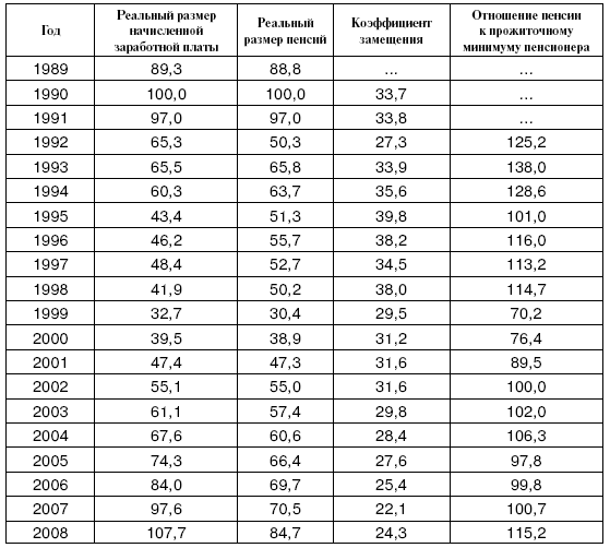 После глубокого падения в 1999 г., когда средний размер пенсии снизился до критической черты и составлял всего 70 % прожиточного минимума пенсионера (ПМП), к 2002 г. средний размер пенсии удалось сравнять с ПМП. Несмотря на то что рост покупательной способности пенсий продолжился и после начала пенсионной реформы, его темпы замедлились. В результате даже спустя девять лет после 1998 г. это соотношение так и не вернулось к докризисному уровню.