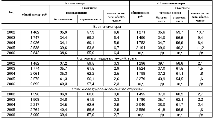 Источники: Форма 94-Собес. Обобщение государственной статистической отчетности в области пенсионного обеспечения за 2002 год // Пенсия. 2003. № 11; Сведения о численности пенсионеров и суммах назначенных им пенсий по Российской Федерации по состоянию на 31 декабря 2003 г. / Пенсия. 2004. № 7; Сведения о численности пенсионеров и суммах назначенных им пенсий по Российской Федерации по состоянию на 31 декабря 2004 г. // Пенсия. 2005. № 7; Отчет о численности пенсионеров и суммах назначенных им пенсий по Российской Федерации по состоянию на 31 декабря 2005 г. // Пенсия. 2006. № 94; Итоги деятельности ПФР за 2006 год // Вестник Пенсионного фонда России. 2007. № 1.