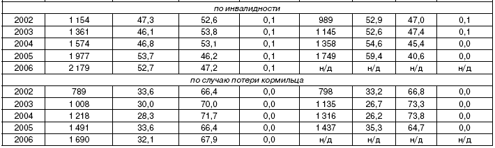 Увеличение доли страховой части пенсии в средних размерах назначенных в отчетном году пенсий было менее выраженным, особенно для пенсионеров по старости и инвалидности, что отражает тот факт, что пенсионные права новых пенсионеров 2002–2004 гг. сформировались в рамках прежней системы и учитывались с ограничением на соотношение индивидуального и среднего по стране заработков. Это также подтверждает то обстоятельство, что относительное увеличение страховой части пенсии для всех пенсионеров происходило исключительно за счет разных темпов индексации. Тем не менее в три первых года реформы пенсионной системе удалось придать импульс для перехода на страховые принципы, когда большая часть пенсионных выплат зависит от реального трудового вклада пенсионера в течение трудовой жизни.