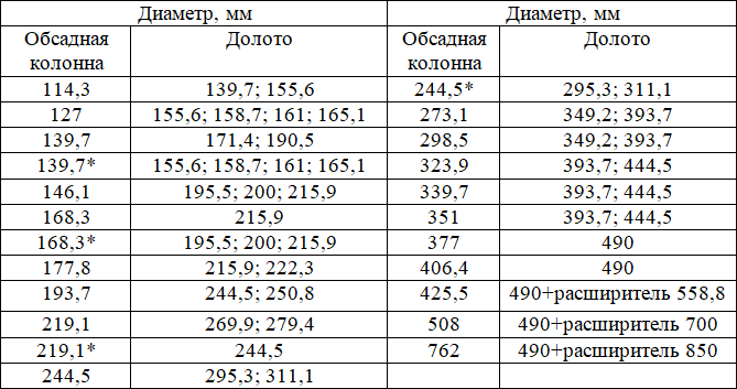 Таблица 5. Рекомендуемые соотношения диаметров долот и спускаемых обсадных колонн [98]