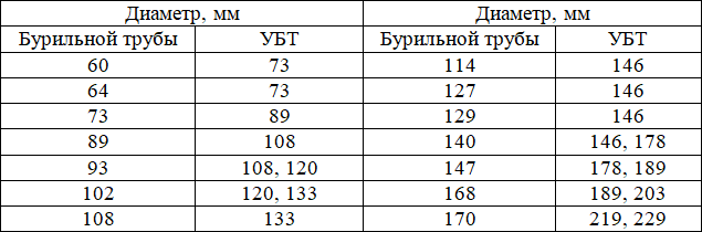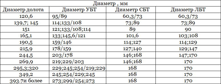 Таблица 9. Рекомендуемые соотношения диаметров бурильных труб и УБТ