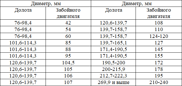 Таблица 11. Рекомендуемые соотношения диаметров долот и забойных двигателей [62]