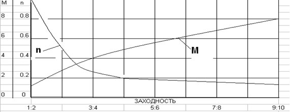 Рис. 7.2. Зависимость момента и частоты вращения вала ВЗД от кинематического соотношения рабочих элементов (D,Q,P-const)
