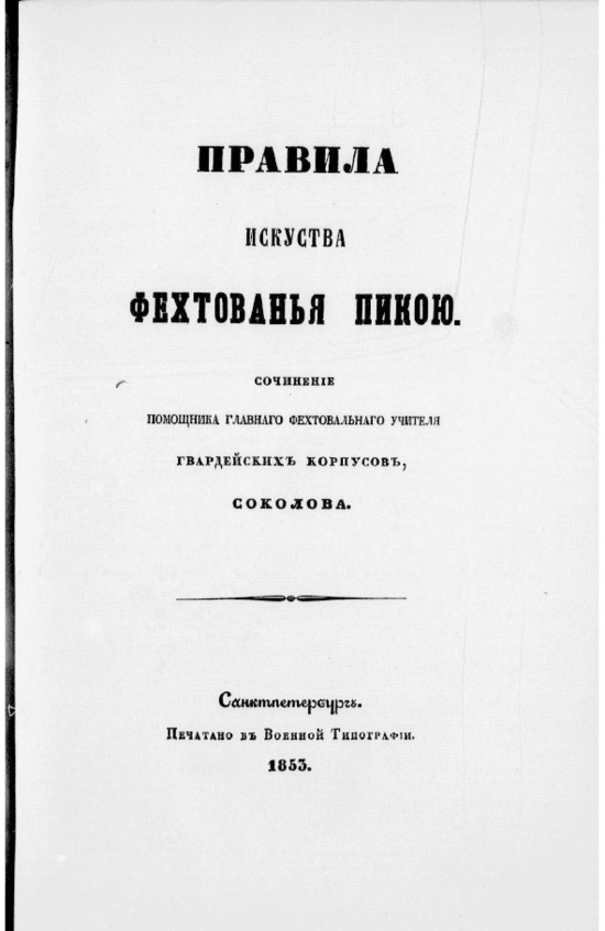 Обложка книги Соколова Н. В. «Правила искусства фехтования пикой» 1853 г.