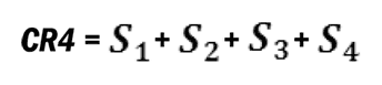 Коэффициент концентрации CR4 (англ. Concentration Ratio) определяется как совокупность долей четырех крупнейших предприятий (в т. ч. холдингов) в выручке отрасли. Он рассчитывается по формуле: