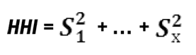 Более совершенным и точным является HHI – индекс Герфиндаля-Гиршмана (англ. Herfindahl-Hirschman Index). Он определяется как сумма квадратов долей всех предприятий (в т. ч. холдингов) в выручке отрасли. Правда, с одной оговоркой: этот индекс учитывает только однозначно известные доли участников рынка, т. е. категория «прочие» при расчетах отбрасывается. Величина HHI может варьироваться от 1<, если доля каждого предприятия безгранично мала, до 10 000 пунктов – в случае, когда доля одного предприятия составляет 100 %. Индекс Герфиндаля-Гиршмана рассчитывается по формуле: