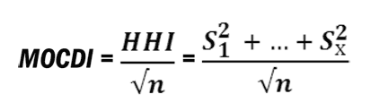 Также Э. Ноэм рассчитал значения своего индекса для абстрактных медиаиндустрий, состоящих из 1–30 предприятий-участников, известные доли которых равны (см. Табл. 1). В том случае, если MOCDI для соответствующего количества предприятий выше указанного уровня (обратное арифметически невозможно), концентрацию в данной медиаиндустрии уже следует считать непропорциональной. Кратность отклонения легко определить исходя из базового (нормативного) значения индекса по Ноэму.