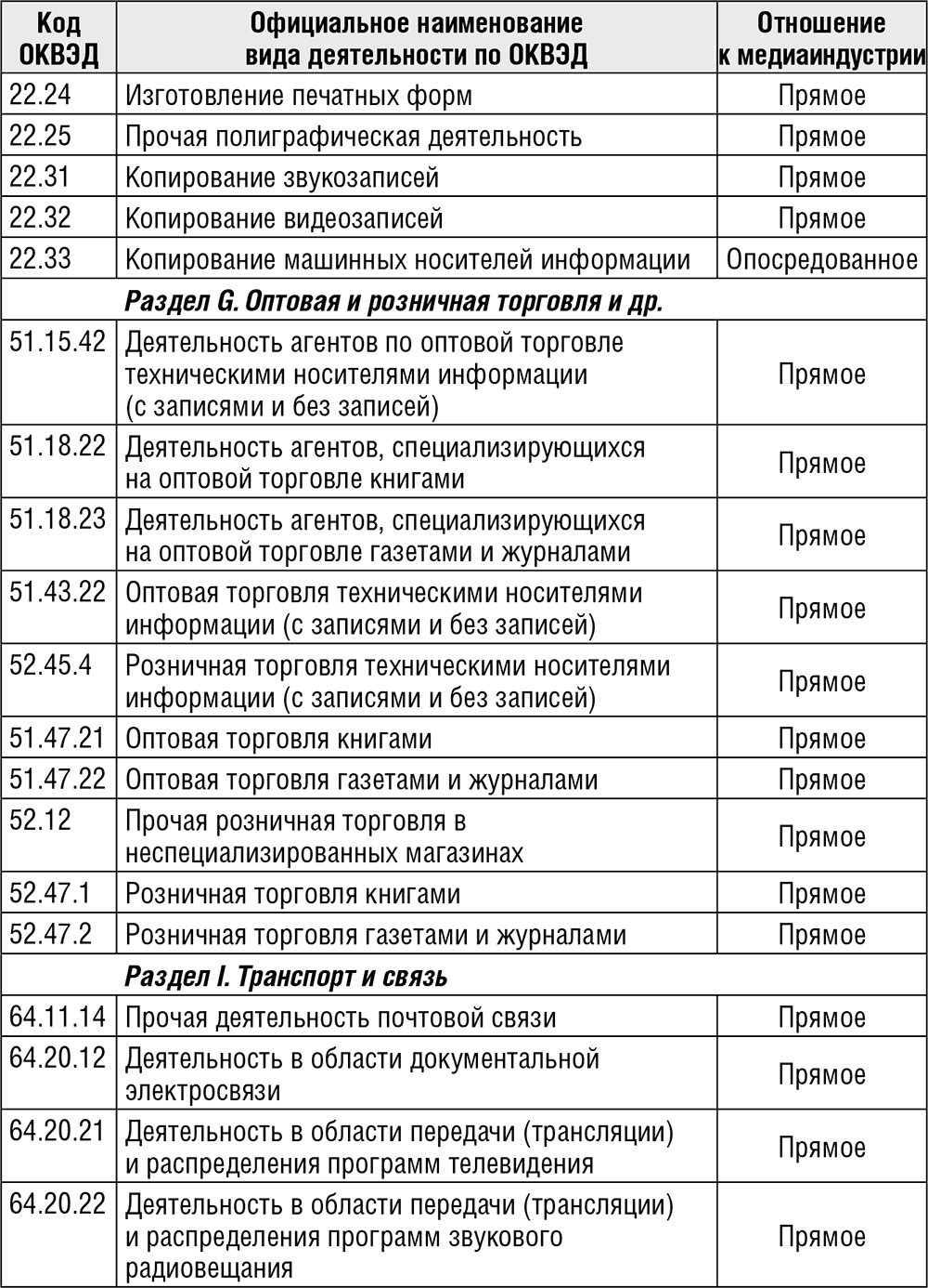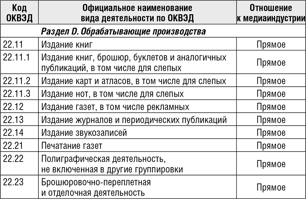 Такие виды деятельности, как издание газет, издание журналов, книгоиздание, полиграфия и рекординг, расположены в ОКВЭД вместе и относительно компактно. Раздел D. «Обрабатывающие производства» содержит подраздел «Целлюлозно-бумажное производство; издательская и полиграфическая деятельность». Этот подраздел содержит такие коды, как 22.11 «Издание книг»; 22.12 «Издание газет, в том числе рекламных», 22.13 «Издание журналов и периодических публикаций», 22.14 «Издание звукозаписей»; 22.21 «Печатание газет»; 22.31 «Копирование звукозаписей» и пр. Нельзя не обратить внимания на тот факт, что издательская, полиграфическая и рекординговая деятельность, согласно ОКВЭД, отнесены к обрабатывающим производствам. Но их прямое соседство с целлюлозно-бумажной отраслью, по крайней мере, обосновано производственной практикой.