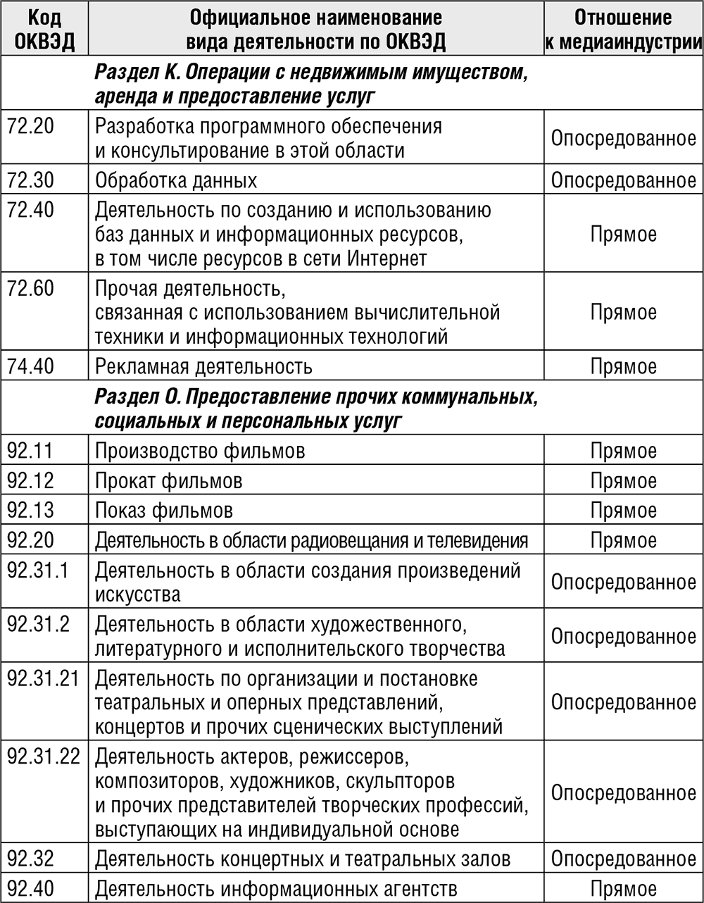Наконец, собственно телерадиовещание, производство аудиовизуального контента, кинематография и работа информагентств отнесены к обширному Разделу О. «Предоставление прочих коммунальных, социальных и персональных услуг». По соседству с политическими и религиозными организациями, бюро ритуальных услуг, прачечными и парикмахерскими находится подраздел «Деятельность по организации отдыха и развлечений, культуры и спорта», который содержит коды: 92.11 «Производство фильмов»; 92.12 «Прокат фильмов»; 92.13 «Показ фильмов»; 92.20 «Деятельность в области радиовещания и телевидения»; 92.40 «Деятельность информационных агентств». Раздел О также содержит группу кодов 92.3 «Прочая зрелищно-развлекательная деятельность». В ней объединены различные виды творческой деятельности, так или иначе связанные с медиаиндустрией. Правда, точно такие же коды могут иметь и организации, не попадающие в категорию медиапредприятий (например, дома культуры и клубы). При этом не исключено и то, что ряд предприятий медиаиндустрии могут иметь и другие коды, расположенные в многочисленных подразделах ОКВЭД с наименованиями «Прочая (прочие)…».