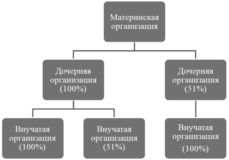 • имущественный холдинг, в котором материнская организация владеет контрольными пакетами акций дочерних;