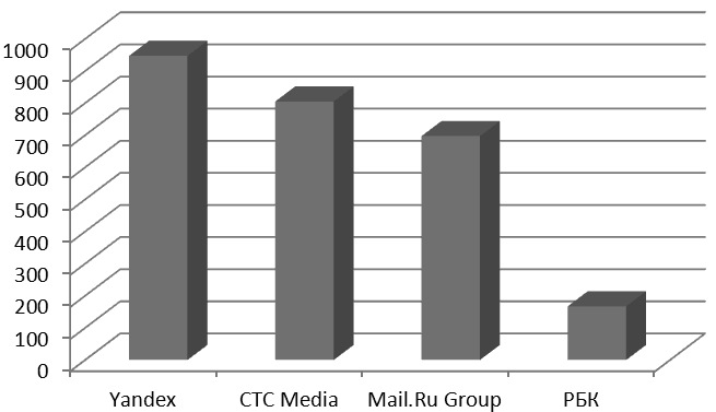 Рис. 5. Консолидированная выручка (Total Revenue) публичных медиахолдингов в 2012 г. по IFRS или US GAAP (млн долл.)[85]