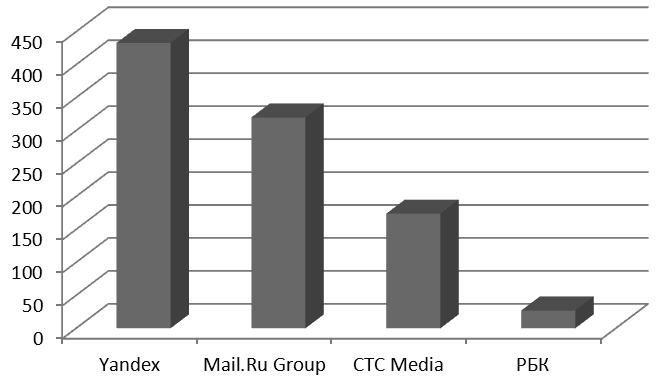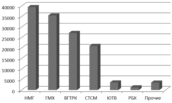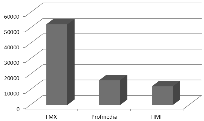 Рис. 14. Выручка медиахолдингов в сегменте федеральных телевещателей в 2012 г. по РСБУ (млн руб.)[95]