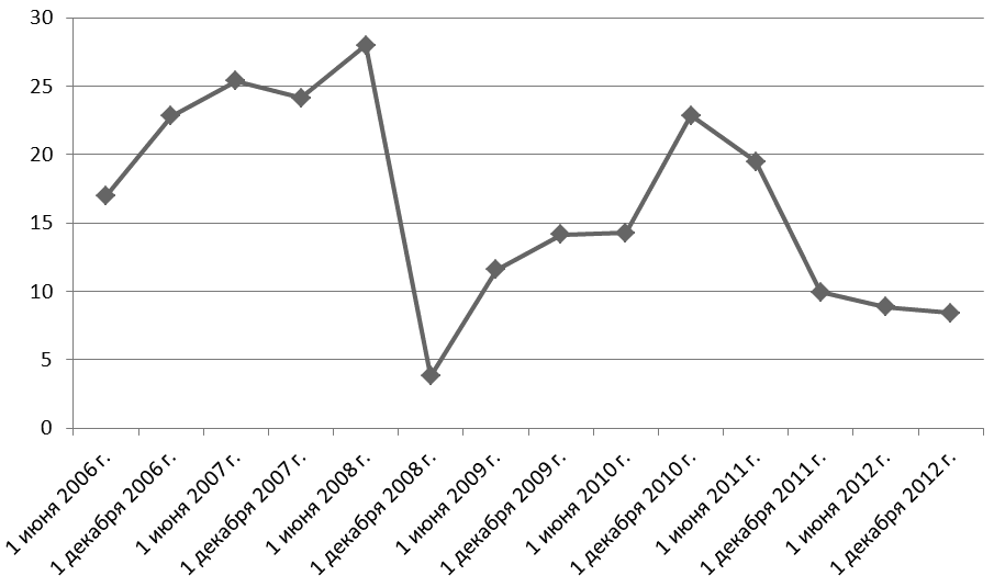 Рис. 8. Котировка акций «СТС Media» на NASDAQ в 2006–2012 гг. (долл.) Источник: сайт организации.