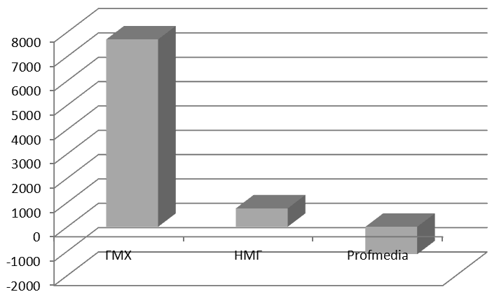 Рис. 7. Консолидированная чистая прибыль (Net Profit) публичных медиахолдингов в 2012 г. по IFRS или US GAAP (млн долл.)[87]