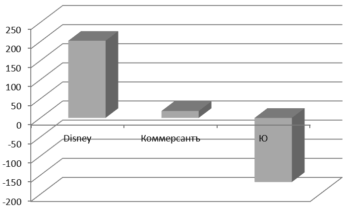 Рис. 12. Чистая прибыль/чистый убыток ИД «Коммерсантъ», Ю и «Disney» в 2012 г. по РСБУ (млн руб.)